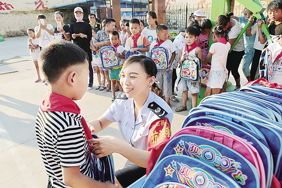 8月31日,河南省安阳县国税局税务人员来到遭受严重洪灾的安阳县都里镇都里小学,为刚开学的小学生带去了150个书包、150套文具、150条红领巾。