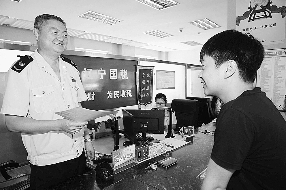 辽宁省盘锦市国税局车辆购置税征收管理分局推进“两学一做”学习教育,组织开展机关转作风为民服务系列活动,并通过党员示范岗亮出党员身份,督促党员立足岗位作贡献。图为该局税务人员解答纳税人涉税问题。