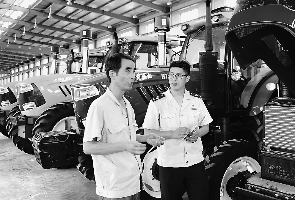 国家税务总局泗县税务局近日对重点税源企业开展走访调研。图为税务人员和安徽泗州拖拉机制造有限公司副总经理徐锡冲分析企业税负情况。