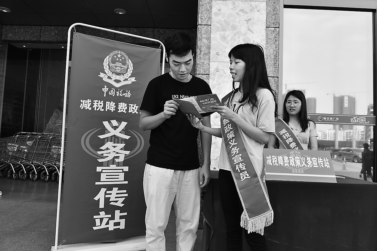 国家税务总局廉江市税务局近日在商场设置减税降费政策义务宣传站,邀请商场工作人员担任减税降费政策义务宣传员,向群众派发小册子,宣传减税降费政策。