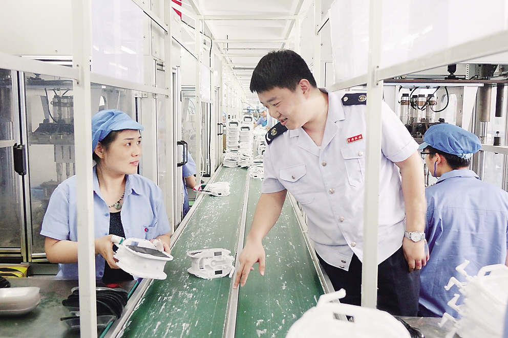 日前,国家税务总局邯郸冀南新区税务局开展“双创”税收优惠政策专题辅导活动,税务干部走进企业了解涉税需求,宣传新版《“大众创业 万众创新”税收优惠政策指引》。图为该局税务人员在车间了解企业生产经营情况。