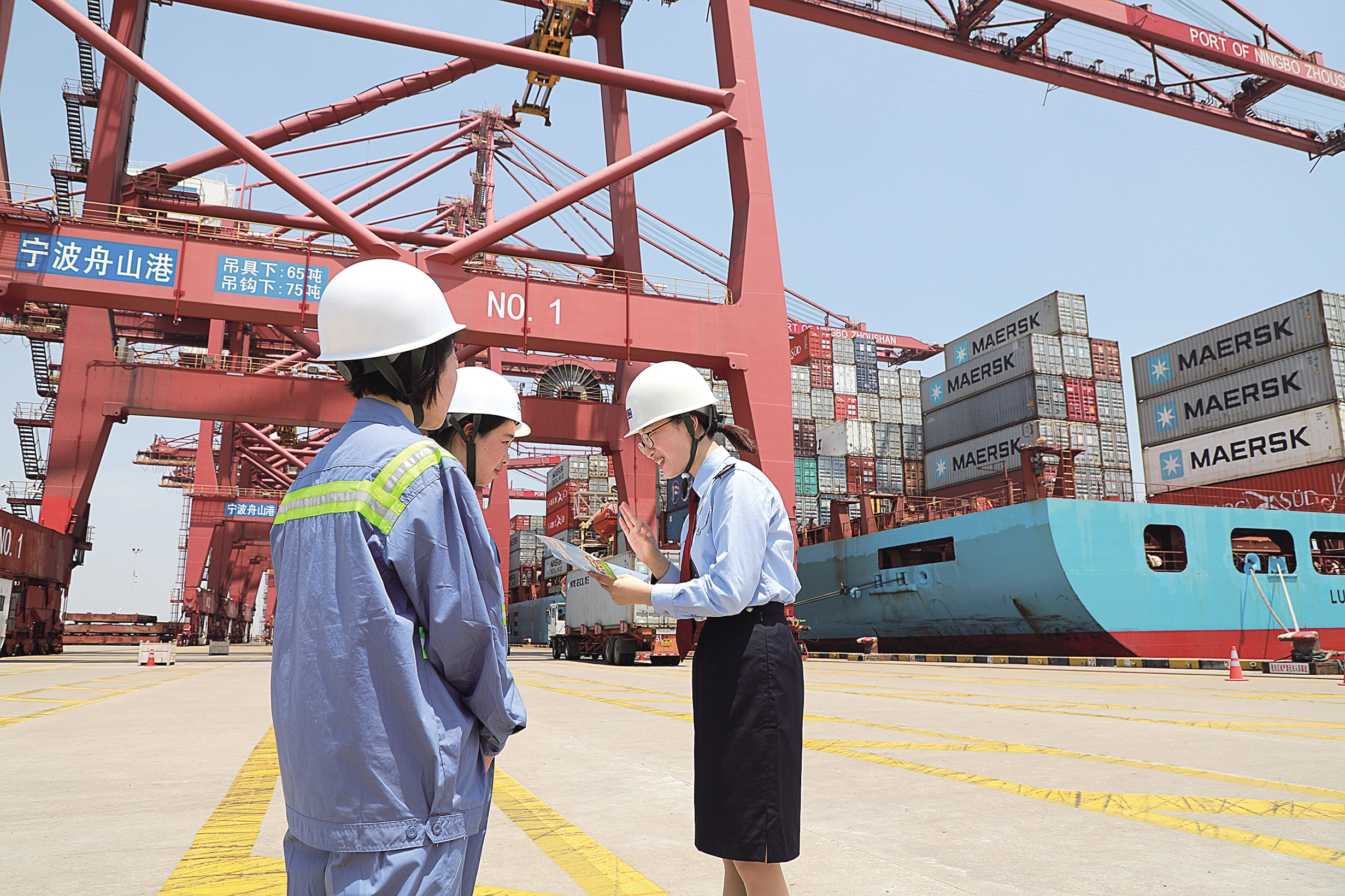 党员服务队到宁波梅山岛国际集装箱码头有限公司开展“服务企业服务群众服务基层”活动。图为税务人员详细解读减税降费政策。