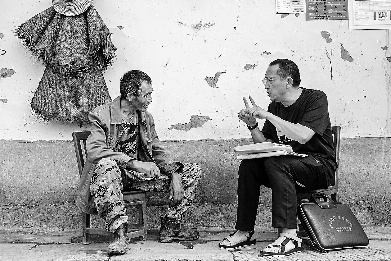 国家税务总局云阳县税务局干部、驻长保村第一书记王兴全(右)扎根长保村,为村里整修便道、安装饮水管线、开发核桃种植基地、发展家禽和水产品养殖,带领乡亲走上致富路。图为王兴全与贫困户交流产业致富心得。