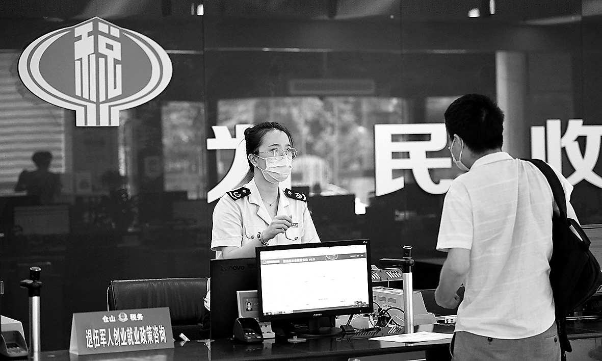 福州市仓山区税务局干部为退役军人解答相关政策问题。