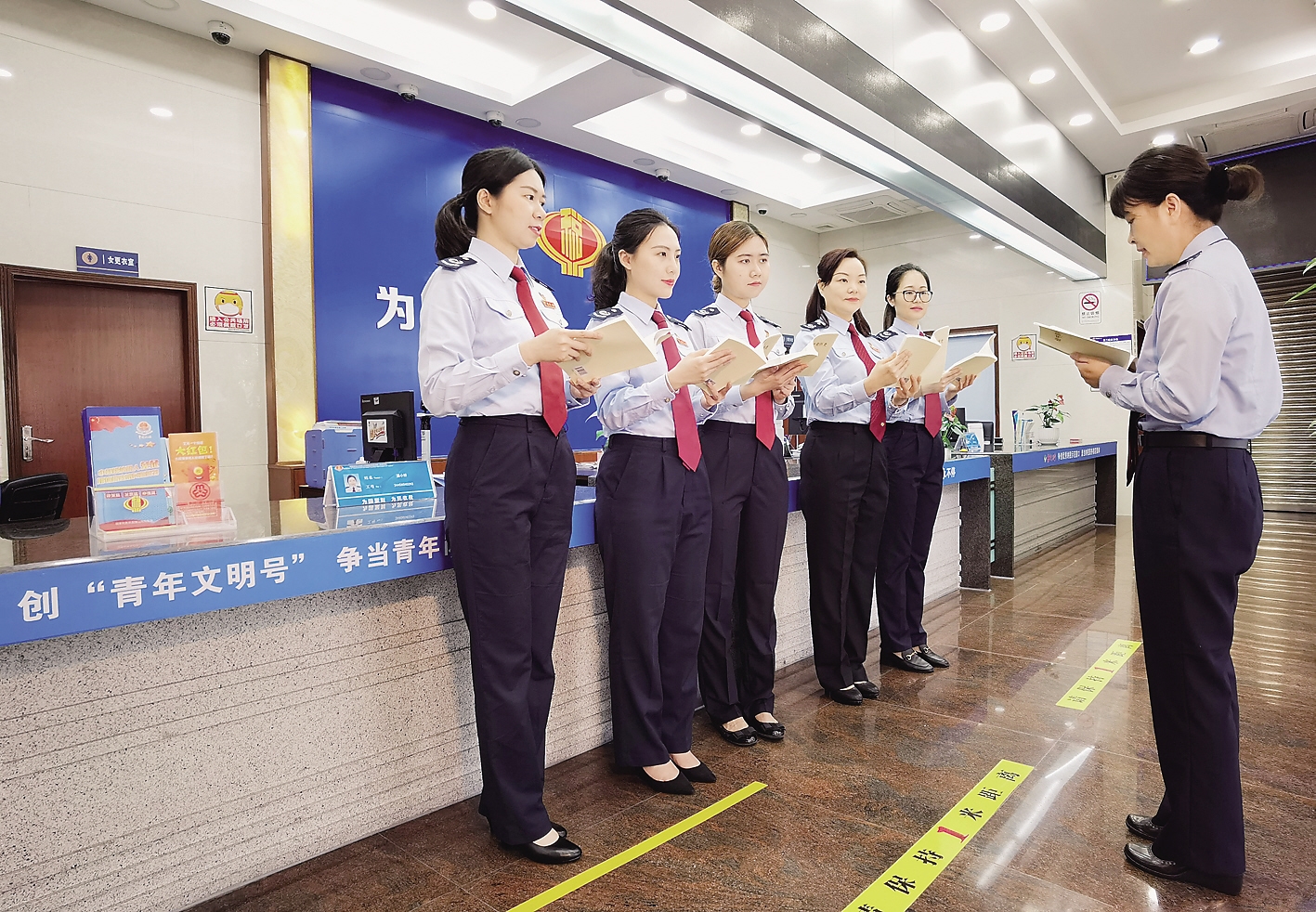 近期,国家税务总局佛山市禅城区税务局采取多种形式,开展党史学习教育。图为该局税务人员利用上班前的15分钟晨会时间一同诵读党史经典。