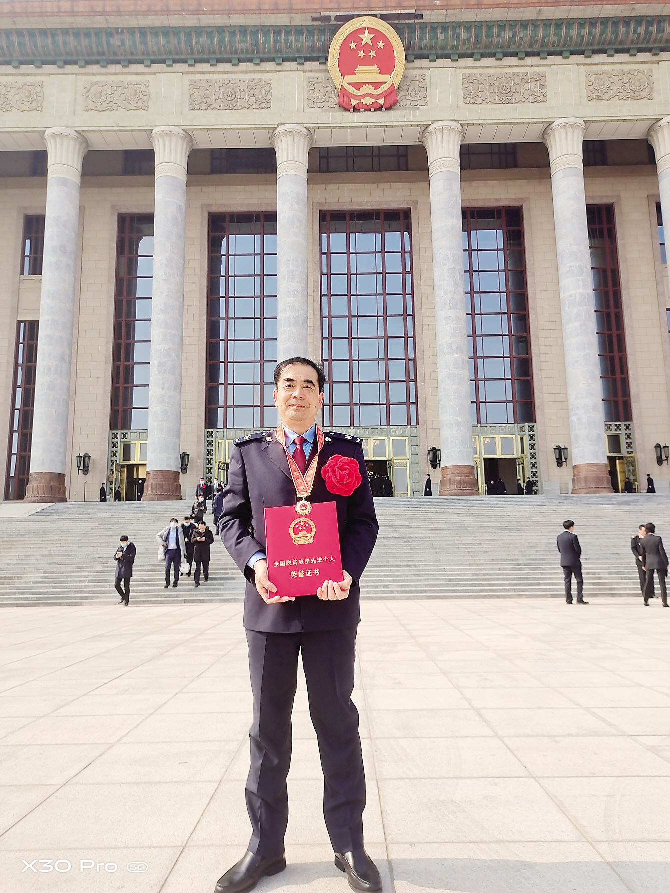 荣获“全国脱贫攻坚先进个人”的肖曙光在北京人民大会堂前留影。