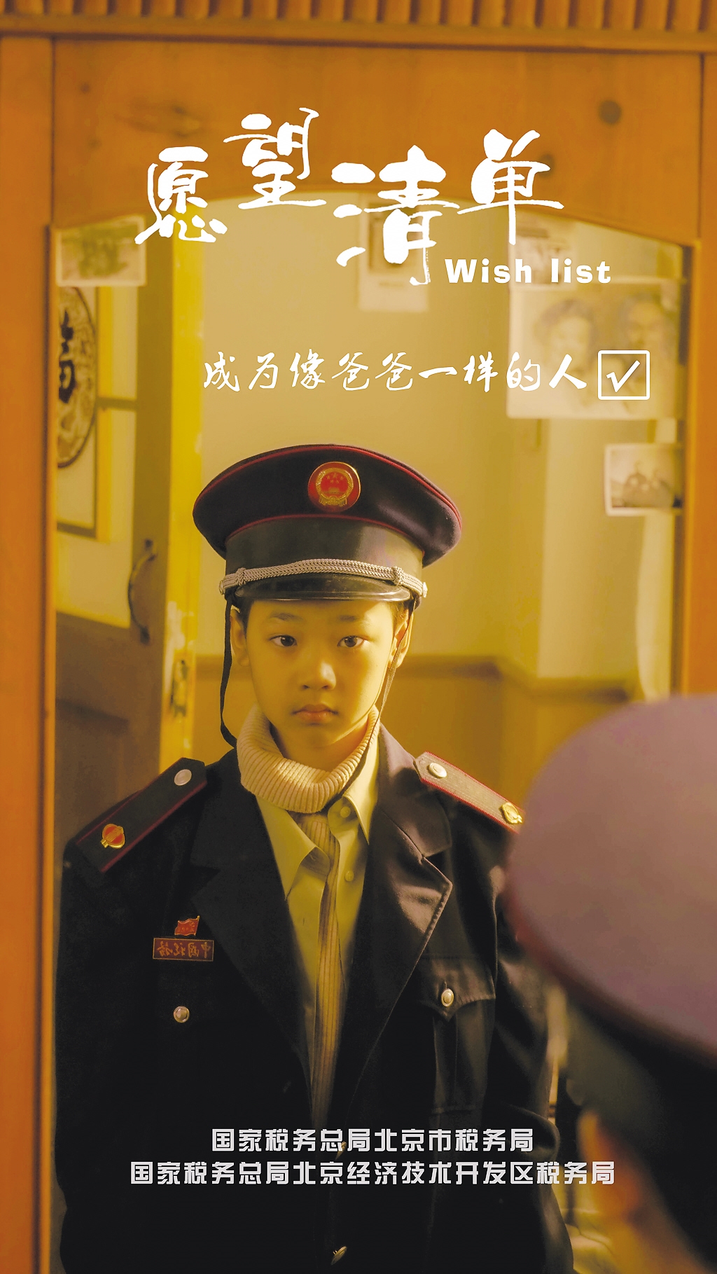 《愿望清单》 《愿望清单》讲述了税务人心怀家国、担当奉献的故事。主人公税务稽查干部林清远为了热爱的税收事业,忽略了对儿子林凡的陪伴,导致父子关系不融洽。林凡有一个儿时的愿望清单,在实现清单第四条的这一天,一件特殊稽查案件的发生,让父子二人得以袒露心声、互相理解。正如电影片尾曲《父亲写的散文诗》中所唱:“可是使命责任在肩……”林清远正是千千万万勇于担当、砥砺前行、平凡却又始终散发着光和热的一代代税务人的缩影。