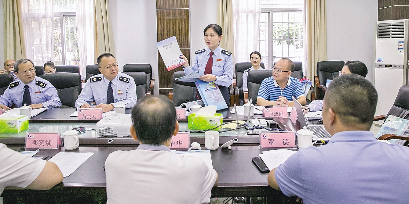 图为“打包”发放的3份涉税报告及沟通会现场税务干部向企业详细介绍报告内容。