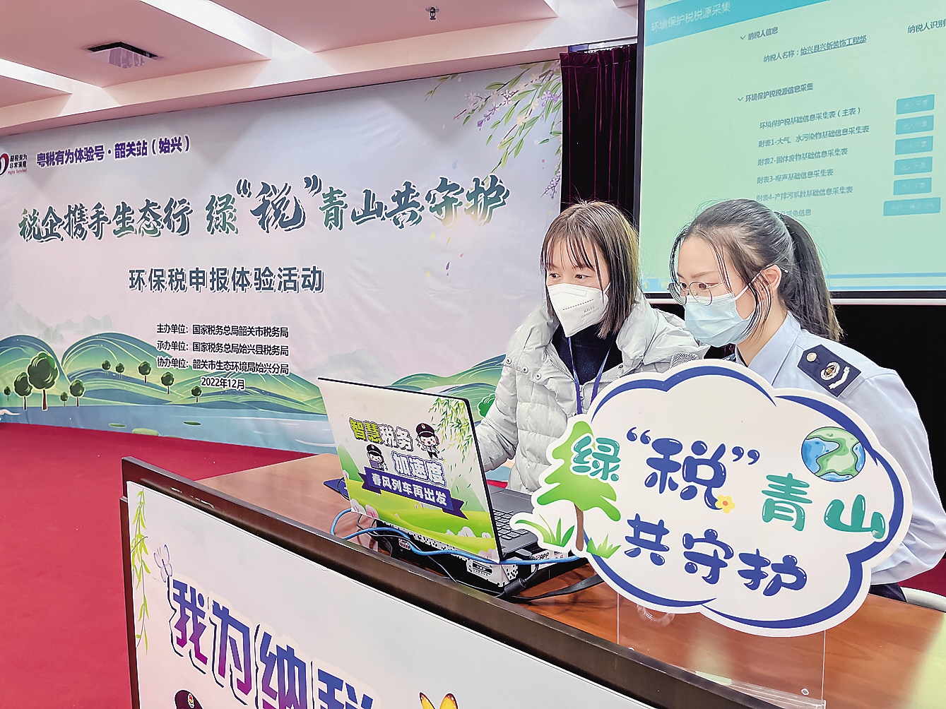 近日,国家税务总局韶关市税务局在韶关市始兴县开展“税企携手生态行 绿‘税’青山共守护”环保税申报体验活动。图为纳税人现场体验环保税申报流程。