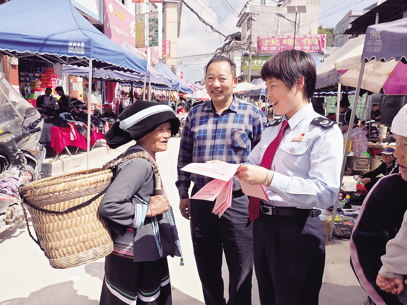 近日,国家税务总局隆林各族自治县税务局青年干部在德峨镇赶圩日为村民发放税费优惠政策宣传单,并解答村民的涉税疑难。