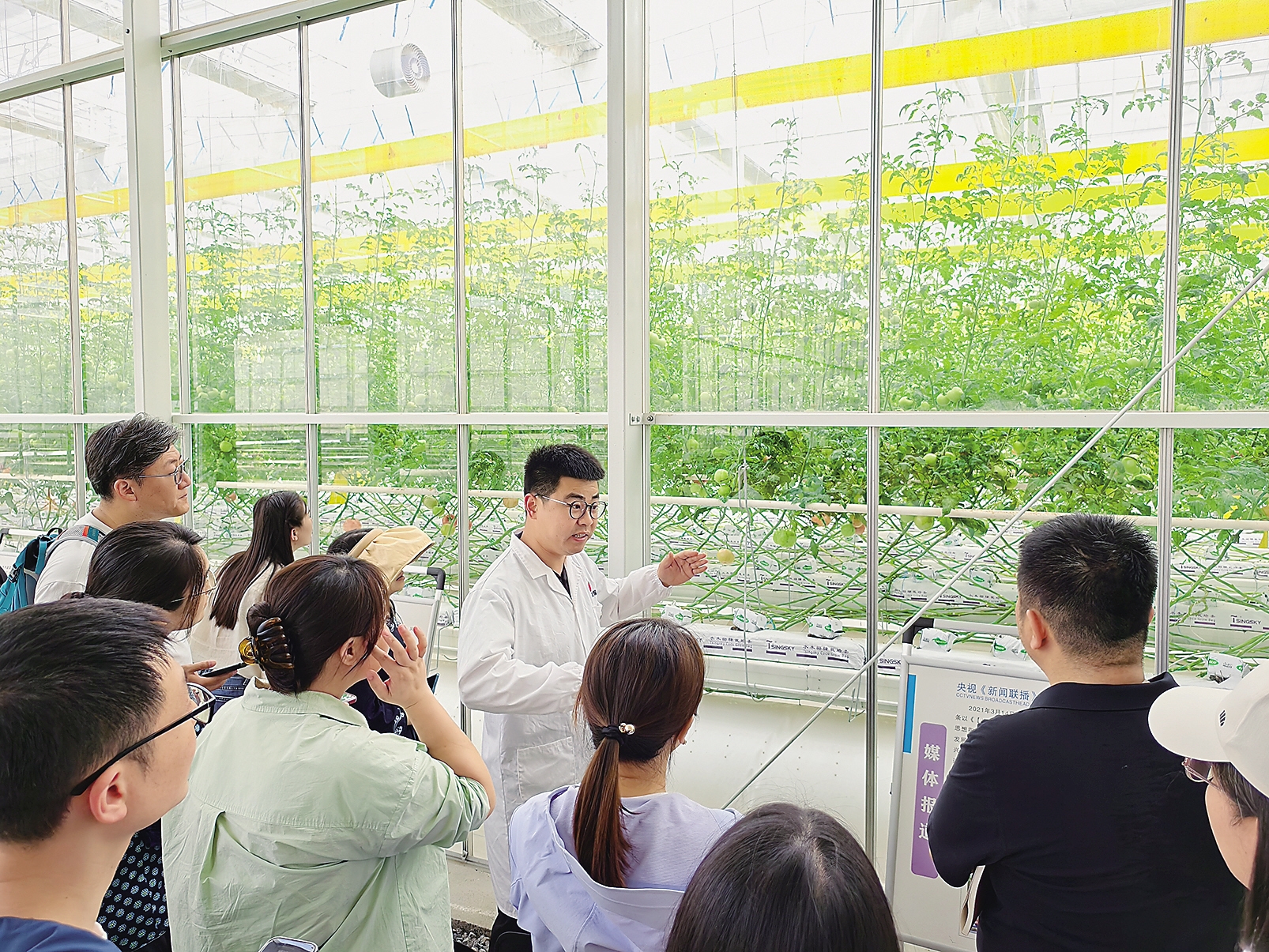 河南省兰考县水木焦桐蔬菜工厂负责人向参观者讲解番茄种植生长过程和水肥一体化系统。