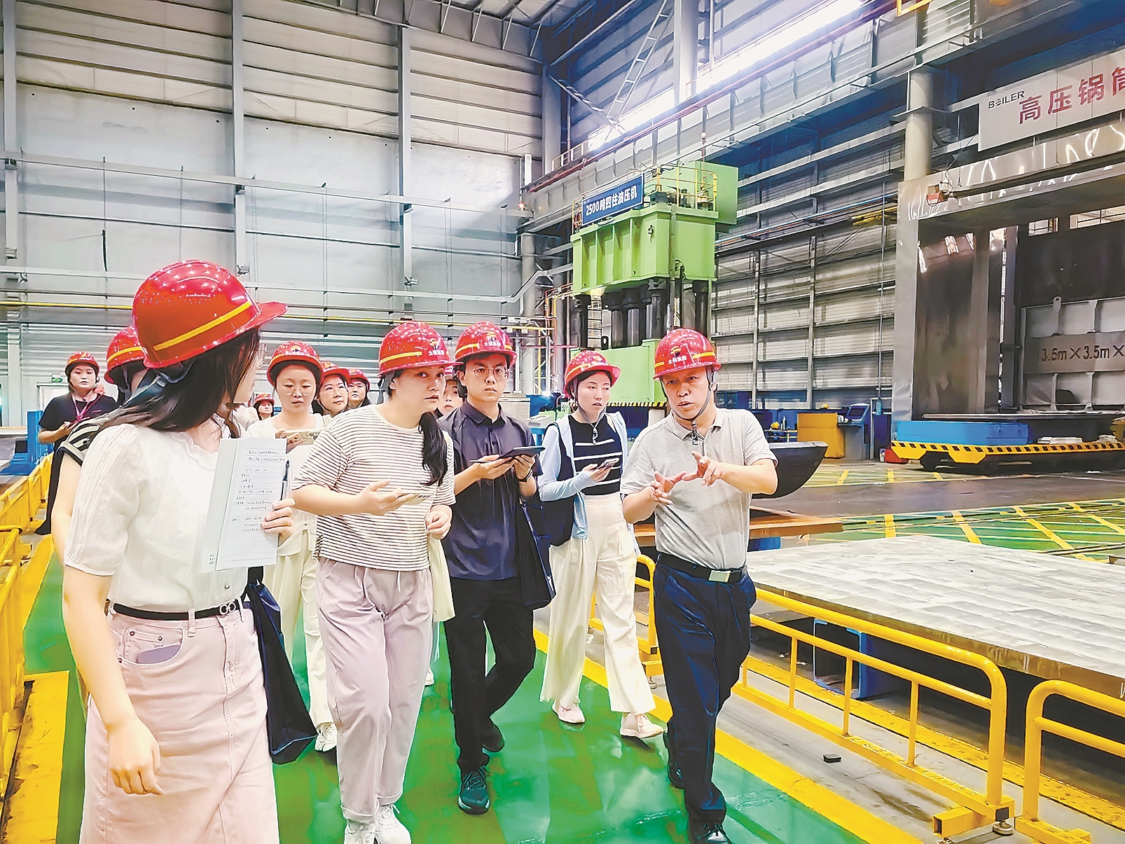 图为太锅集团总经理助理孙江勇(右一)向通讯员介绍新一代低碳循环流化床锅炉生产工艺。