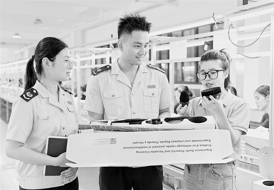 近日,国家税务总局宁海县税务局组织青年干部到辖区企业走访调研,对企业适用税费政策开展合规辅导。图为税务干部在一家塑胶科技企业了解产品的研发和市场应用情况。