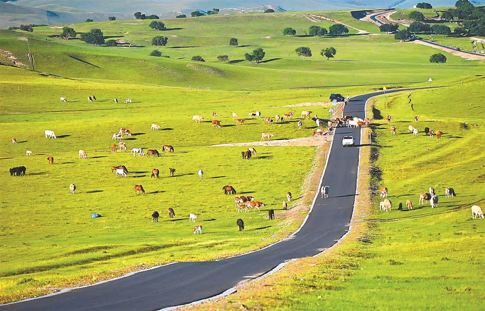 内蒙古西乌珠穆沁旗草原“99号公路”,是乌珠穆沁草原文化旅游景观带的重要节点,又被称为“中国最美草原公路”。夏日,在“99号公路”延长线上,成群的牛马自由觅食。