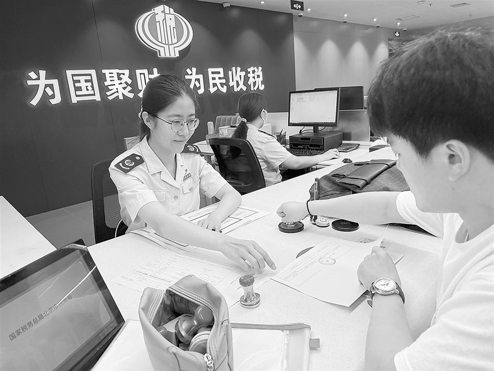 国家税务总局北京市海淀区税务局优化办税服务厅区域布局,构建“前台接单、中台流转、后台保障”的工作模式,提升纳税人办税效率。图为税务干部近日在为一名纳税人办理税务信息变更业务。