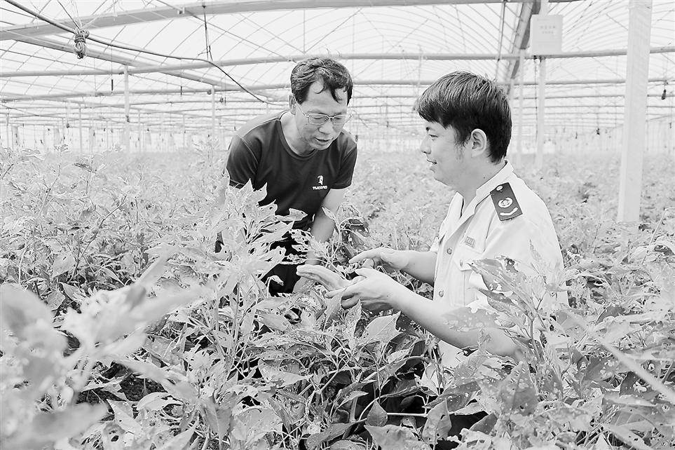 近日,国家税务总局宝应县税务局采取数据分析、实地走访等方式,核实完善税源基础管理信息。图为税务干部在扬州信德康农业科技有限公司种植基地,了解企业农产品产销情况。