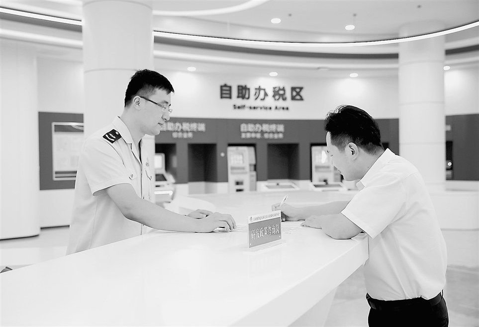 国家税务总局秦皇岛市北戴河区税务局在办税服务厅设置研发政策咨询岗,为纳税人解答企业研发相关政策疑问。图为税务干部近日向一名纳税人讲解研发费用加计扣除政策的有关规定要求。