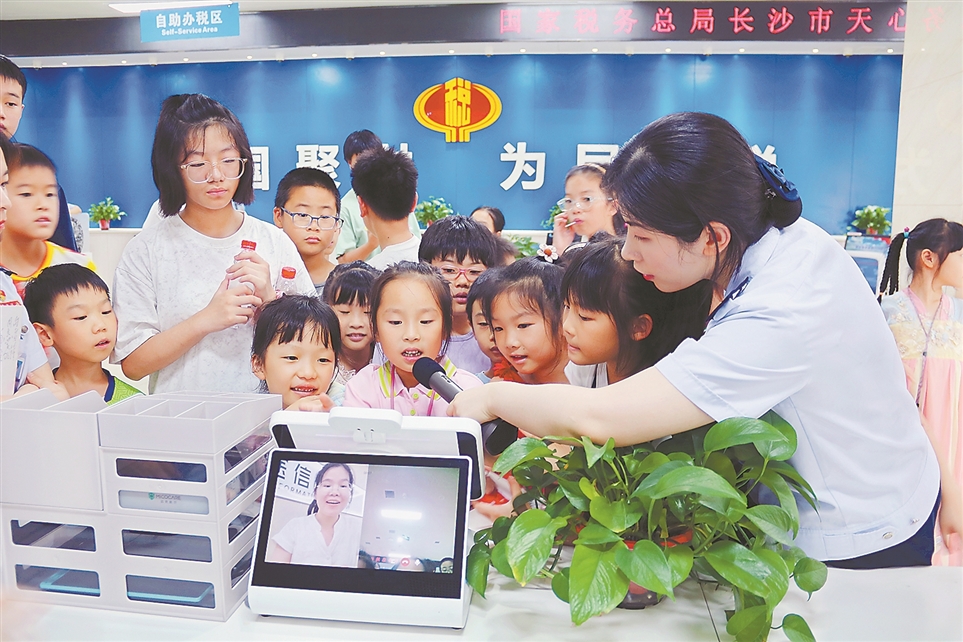 近日,国家税务总局长沙市天心区税务局组织20余名中小学生走进办税服务厅,在互动体验中学习税收知识。