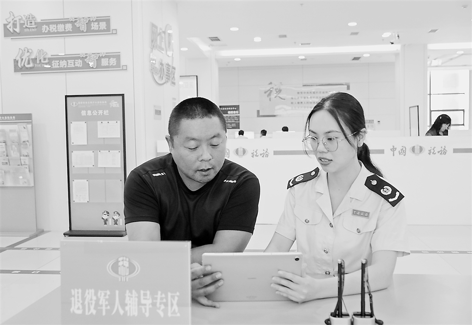 国家税务总局沂水县税务局在办税服务厅开设退役军人辅导专区,为退役军人提供政策咨询、涉税辅导等服务。图为税务干部近日为一名准备创业的退役军人介绍相关税费支持政策。