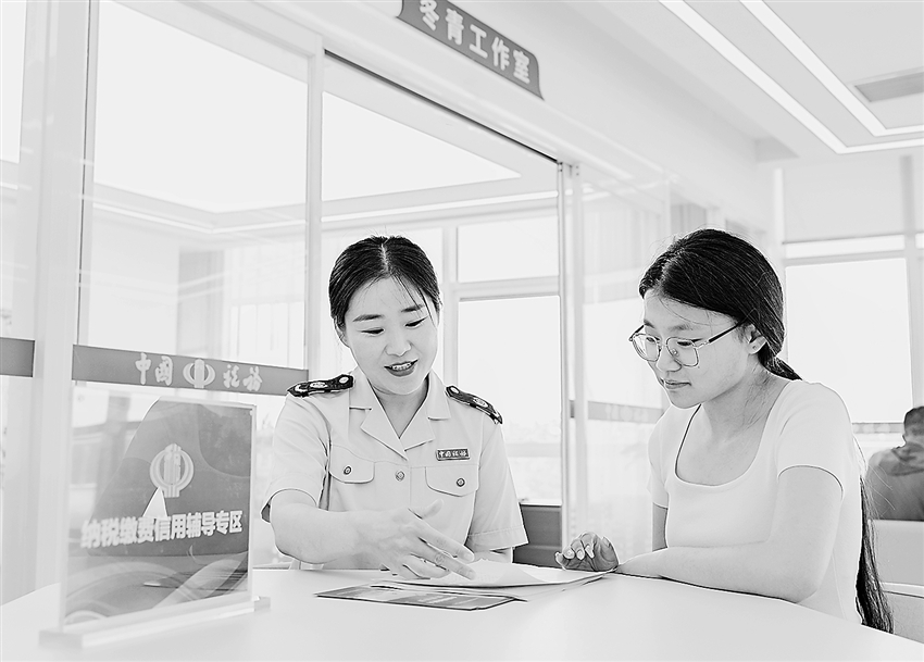 国家税务总局临沂市河东区税务局在办税服务厅设立纳税缴费信用辅导专区,为企业办税人员讲解《纳税缴费信用管理办法》,提供纳税信用修复指导。图为近日税务干部在辅导企业财务人员填写《纳税缴费信用修复申请表》。