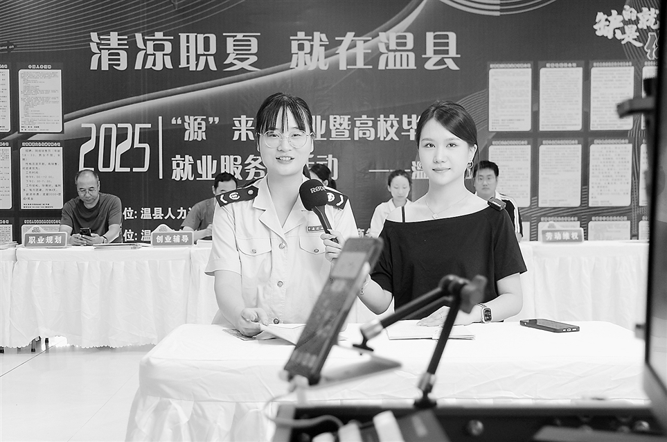 近日,国家税务总局温县税务局干部走进当地招聘现场,向求职人员和招聘企业宣传有关就业创业税费政策。图为税务干部通过抖音直播解读税收政策。