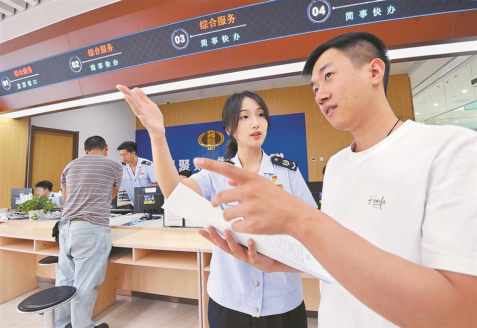 今年以来,各地税务部门以办税服务厅转型为契机设立“简事快办”专窗,对特定简单、高频的涉税事项提供快速办理服务,以减少纳税人的等候时间和办理成本,进一步完善税费诉求解决机制,提高服务厅办事效率。左图为北京市朝阳区税务局第一税务所“简事快办”专窗税务干部,向纳税人介绍业务办理的操作流程和注意事项。右图为纳税人在湖南省湘潭县税务局办税服务厅“简事快办”专窗办理相关涉税业务。 苏御 王善宏 黄盼 摄