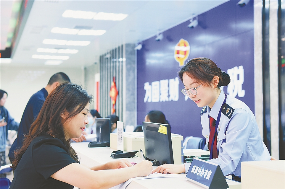 今年以来,各地税务部门以办税服务厅转型为契机设立“简事快办”专窗,对特定简单、高频的涉税事项提供快速办理服务,以减少纳税人的等候时间和办理成本,进一步完善税费诉求解决机制,提高服务厅办事效率。左图为北京市朝阳区税务局第一税务所“简事快办”专窗税务干部,向纳税人介绍业务办理的操作流程和注意事项。右图为纳税人在湖南省湘潭县税务局办税服务厅“简事快办”专窗办理相关涉税业务。 苏御 王善宏 黄盼 摄