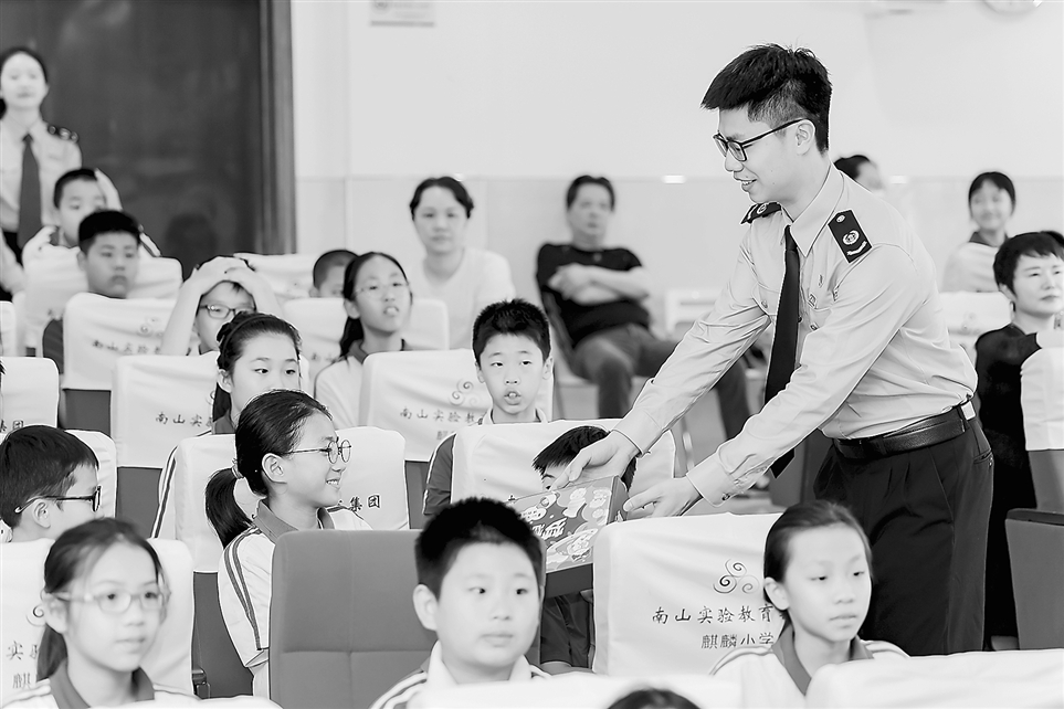 近日,国家税务总局深圳市南山区税务局干部走进南山区麒麟小学,开展税法知识抢答活动,为全校学生上了一堂生动的税法知识普及课。图为税务干部向抢答正确的小学生赠送小礼物。