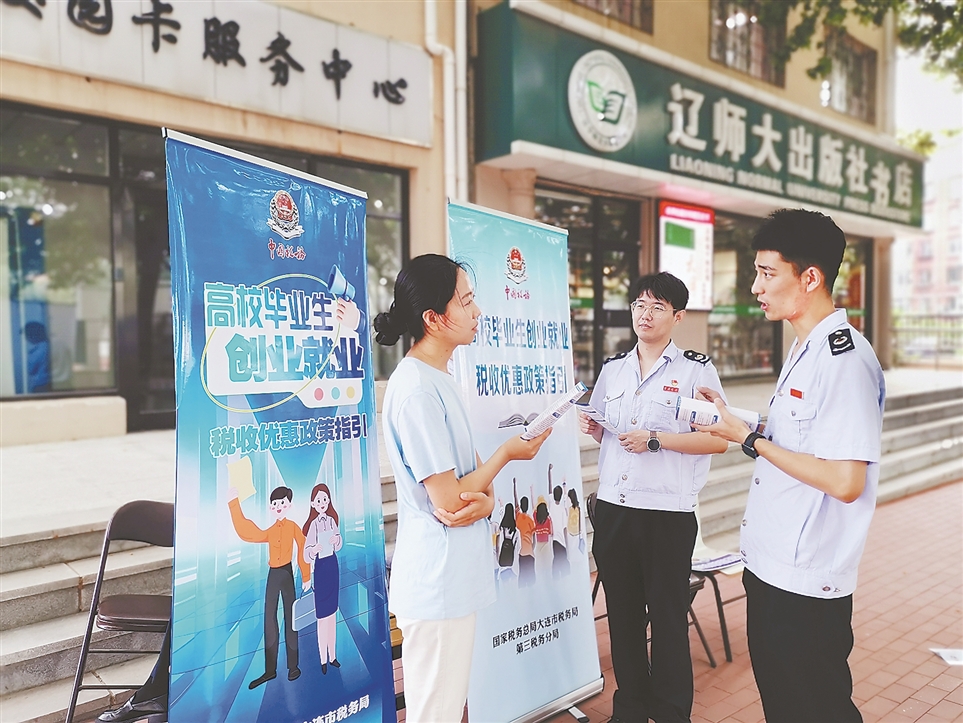 日前,国家税务总局大连市税务局第三税务分局干部走进辽宁师范大学,为高校毕业生开展创业就业税收优惠政策辅导。