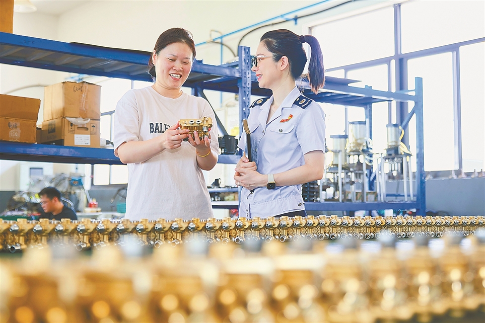 近期,国家税务总局宁波前湾新区税务局为重点出口企业定制专属“合规指南”,帮助出口企业合规办理涉税事项。图为税务干部在慈溪远力机械有限公司了解其产品生产和出口情况。