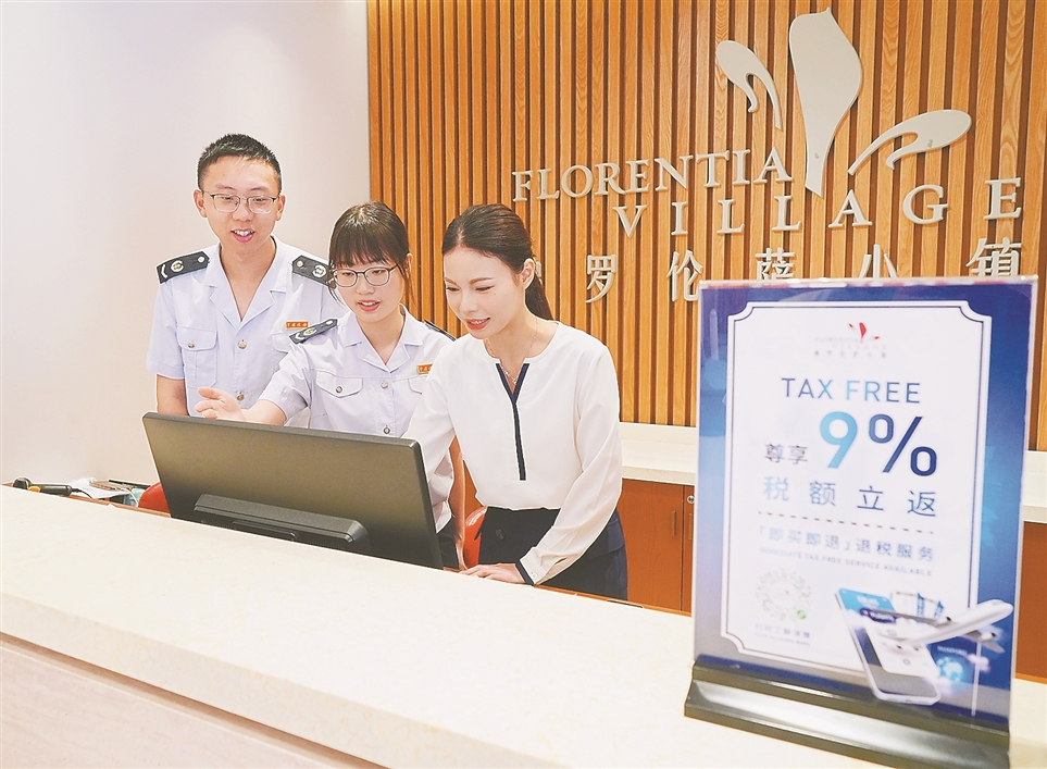 近日,国家税务总局佛山市南海区税务局干部来到该市首个离境退税“即买即退”试点商店——佛罗伦萨小镇广佛名品奥特莱斯商店,开展政策宣传。图为税务干部为商店工作人员讲解退税政策和系统操作要点。