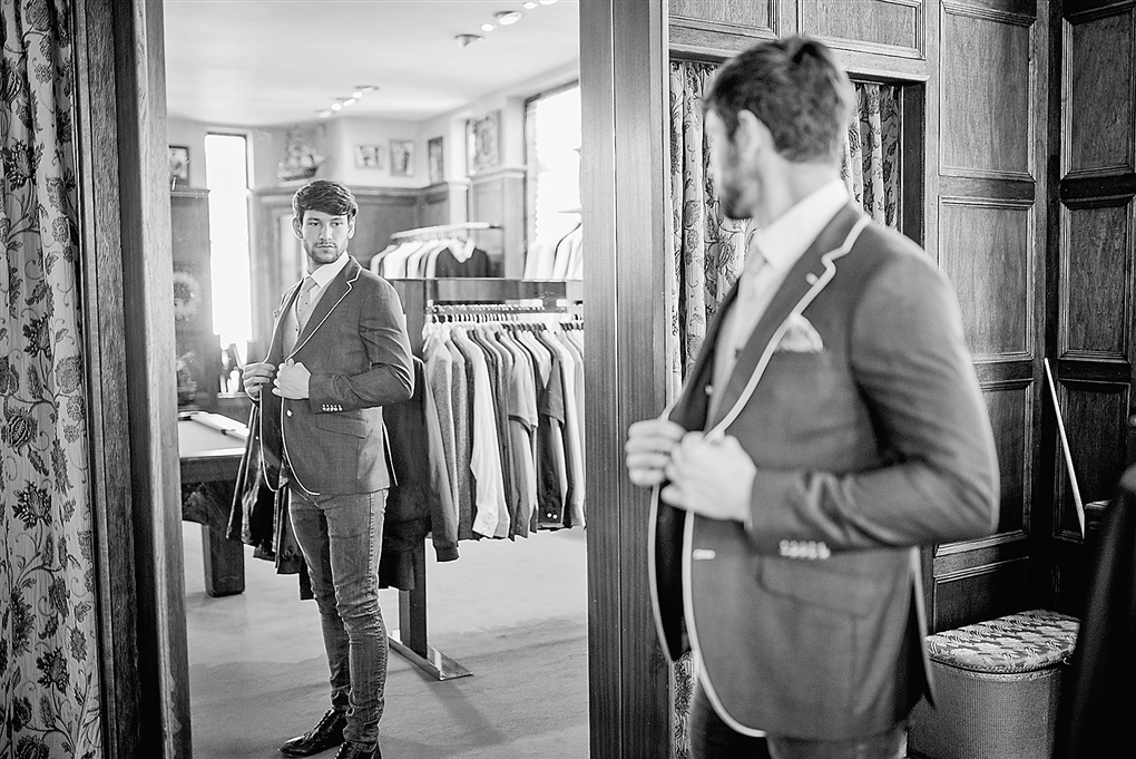因伪造进出口记录骗取巨额退税及贩卖假货,潜逃的英国“山寨服装大亨”阿里夫·帕特尔及其同伙近日被捕。图为一位英国男士在服装店试装。