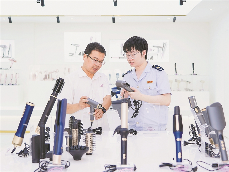 近日,国家税务总局慈溪市税务局干部走进宁波瑞卡电器有限公司,专项解读出口贸易涉税政策,对可能出现的风险点进行提示提醒。图为企业负责人向税务干部介绍热门产品高速吹风机。