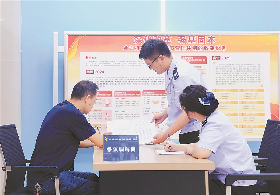 日前,两名调解员在重庆市开州区税务局办税服务厅税费争议调解室为一位纳税人细致解答增值税纳税申报争议问题。