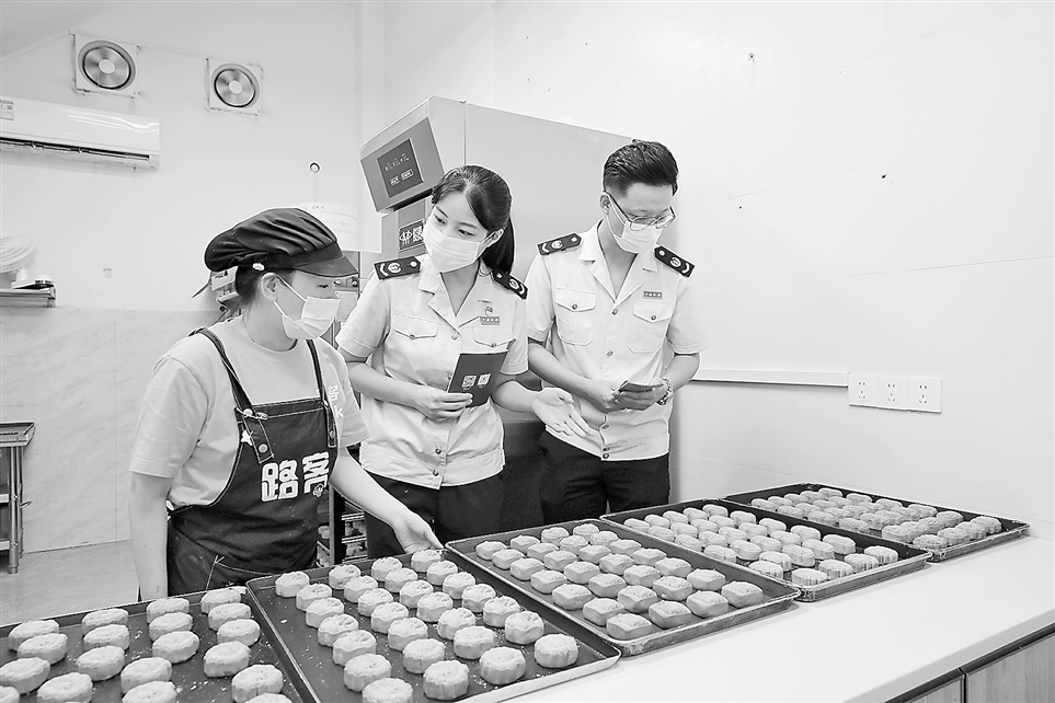 临近中秋,国家税务总局防城港市港口区税务局干部走进辖区月饼生产企业,了解产品生产销售情况,收集涉税需求,辅导企业合规适用税费政策。图为该局干部在一家食品公司了解月饼生产和经营情况。