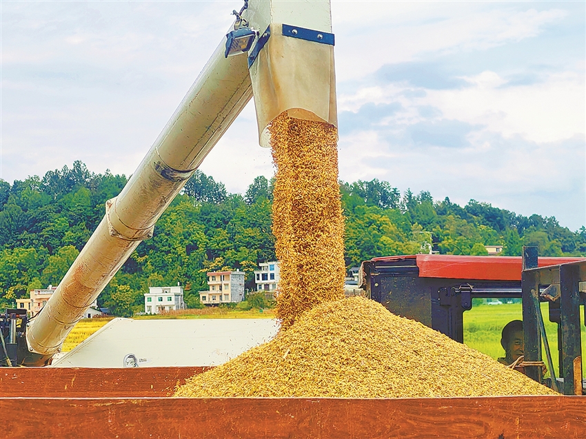 日前,湖南省龙山县石羔街道甘壁寨稻谷喜获丰收。今年,当地农户用上了本地企业专为山区地形设计生产的联合收割机,水稻收割效率得到有效提升。