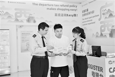今年以来,国家税务总局南宁市税务局通过一系列创新举措,落实落细离境退税政策,让“入境流量”加速转化为“消费留量”,扩大入境消费。图为南宁市兴宁区税务局干部近日在南宁百货大楼退税商店内,向越南游客讲解离境退税“即买即退”流程。