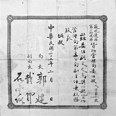 苏皖边区第二行政区货物管理局委任状。