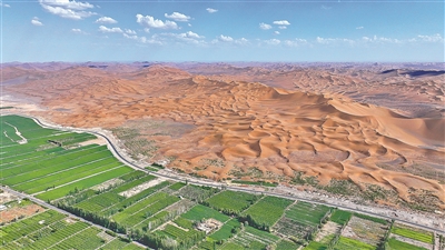 “三北”工程实施以来,新疆人工绿洲面积不断扩大,由30年前的6.5万平方公里增至目前的10万平方公里,筑起了一道抵御风沙、保持水土、护农促牧的绿色长城,给各族群众带来绿色和幸福。图为新疆鄯善县库木塔格沙漠边缘的防护林。
