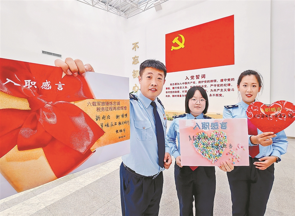 日前,国家税务总局青岛市市北区税务局在今年新录用的18名干部中开展“写感言、立初心、向新程”活动。图为从军六载、两次荣立三等功、退伍后考入该局的青年干部张振华(左)与新入职同事展示入职感言。
