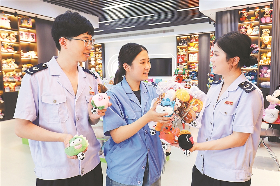 近期,“苏超”联赛掀起的“体育+文旅”热潮,为扬州毛绒玩具企业带来不少新订单。图为国家税务总局扬州市邗江区税务局干部走进当地毛绒玩具企业开展政策辅导。