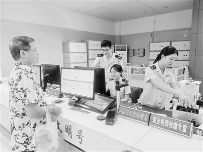 国家税务总局平和县税务局在办税服务场所开设现金专窗,为不会使用电子支付方式或习惯使用现金的老年群体提供社保缴费便利。图为现金专窗的税务干部日前为一名老年缴费人办理社保缴费业务。
