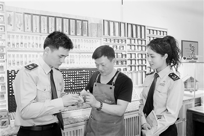 江苏省徐州市云龙区户部山文化街区将非遗项目融入日常文旅体验,年均举办200余场非遗展演活动。图为徐州市云龙区税务部门干部在街区向相关商户了解非遗产品销售情况,提示提醒相关税务风险。