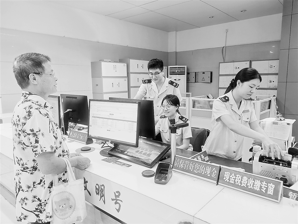 国家税务总局平和县税务局在办税服务场所开设现金专窗,为不会使用电子支付方式或习惯使用现金的老年群体提供社保缴费便利。图为现金专窗的税务干部日前为一名老年缴费人办理社保缴费业务。