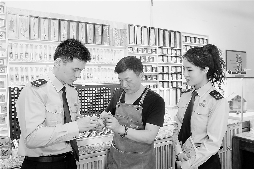 江苏省徐州市云龙区户部山文化街区将非遗项目融入日常文旅体验,年均举办200余场非遗展演活动。图为徐州市云龙区税务部门干部在街区向相关商户了解非遗产品销售情况,提示提醒相关税务风险。