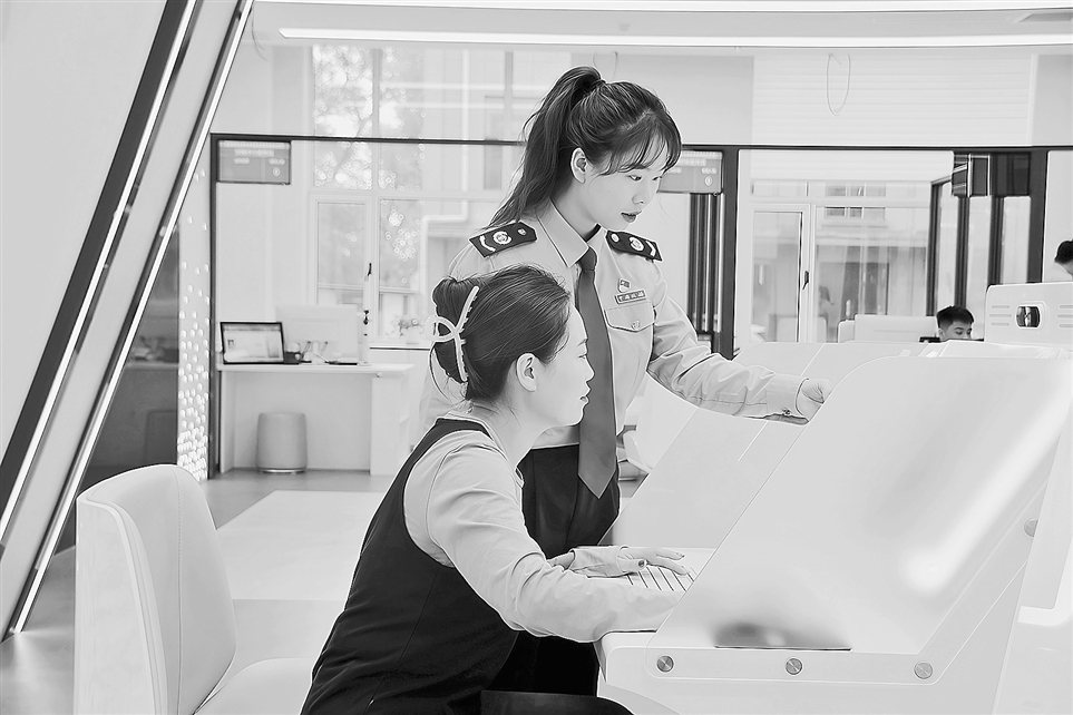 近日,国家税务总局长岭县税务局办税服务厅完成升级改造,以智能自助办税终端为中枢,对全厅涉税业务进行线上集中调度,提高纳税人缴费人办税缴费便利度。图为税务干部辅导纳税人使用智能自助终端办理税费申报。