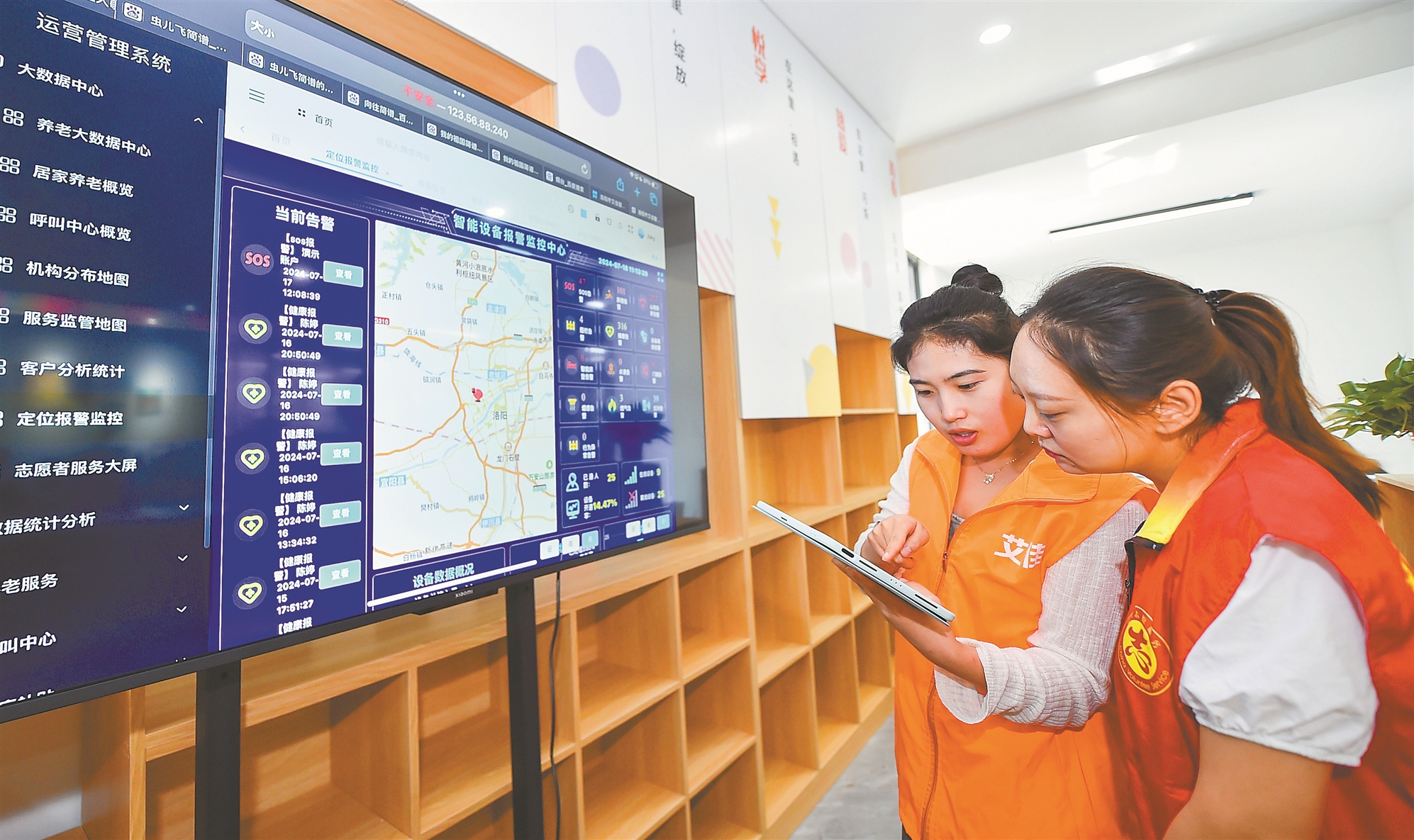 10月是我国第16个全国敬老月。“十四五”以来,我国全面建立国家基本养老服务制度,供给结构不断优化,老年人保障水平稳步提升,老年友好的社会环境加快形成。基本养老保险参保人数超过10.7亿人,全国养老机构和设施达40.6万个,护理型养老床位占比达到64.6%,提前完成“十四五”规划的55%的目标任务。税收数据显示,2021年—2024年,国家在养老、托幼、医疗、教育等领域实施的惠民税收优惠政策,年均减免税增长11.7%,有力促进了民生改善。 图为在河南洛阳市涧西区武汉路街道秦岭路社区养老服务中心,工作人员和社区志愿者在查看智慧养老服务监控平台。