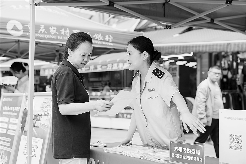 今年以来,国家税务总局重庆市税务局按照“便民办税春风行动”有关要求,与多家银行机构实现终端系统互联互通,进一步拓宽自然人社保缴费渠道。图为重庆市万州区税务局近日联合重庆农村商业银行万州分行开展社保缴费渠道、缴费流程宣传辅导。
