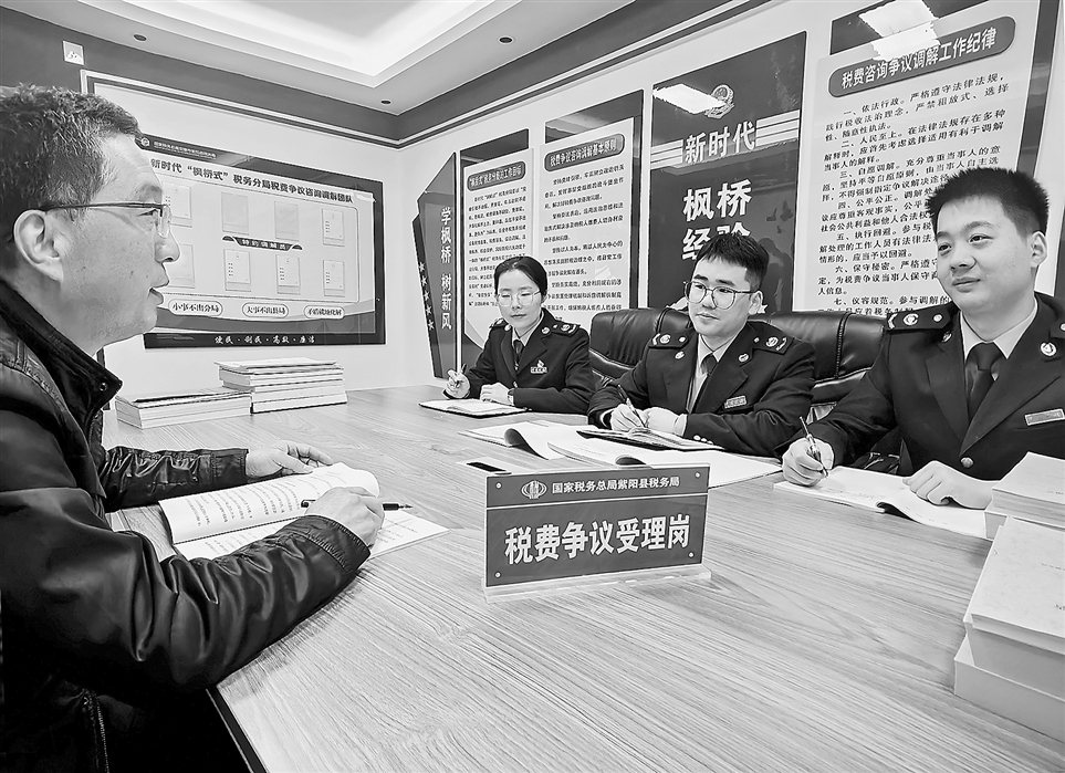 近期,国家税务总局紫阳县税务局通过拓展诉求响应渠道、强化部门联动等方式完善纳税人缴费人权利救济和税费争议解决机制,积极化解税费争议。图为该局调解团队在为一位纳税人解决争议问题。