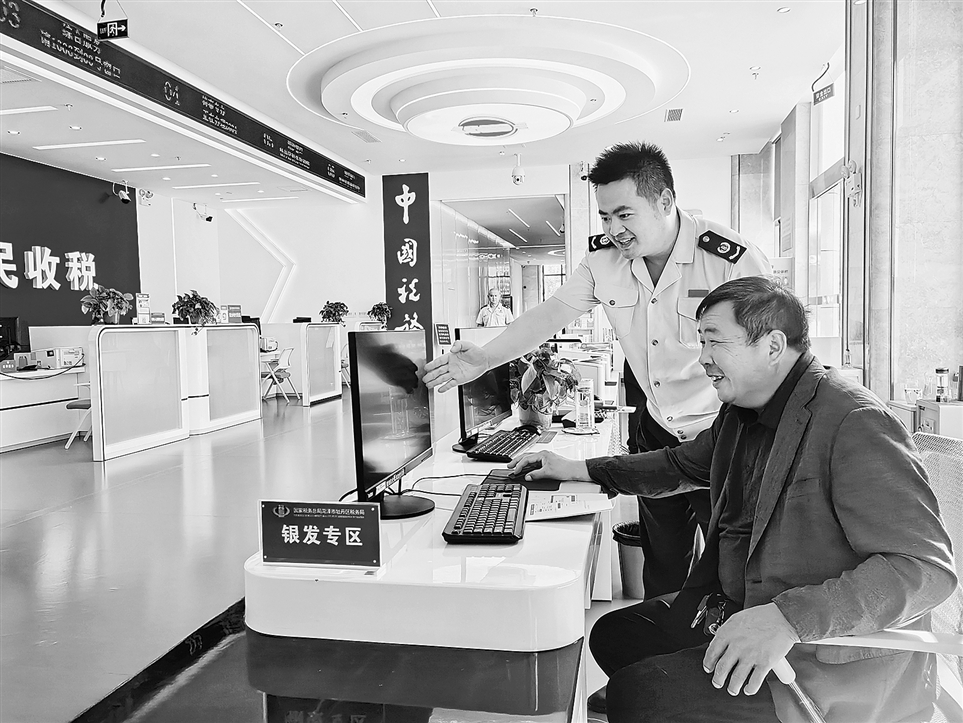 国家税务总局菏泽市牡丹区税务局在办税服务厅开设“银发专区”,以“传统+智能”融合形式为老年纳税人缴费人提供专属服务。图为税务干部近日辅导一名老年纳税人办理有关业务。